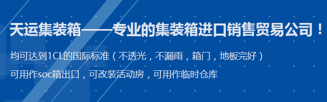 青島天運集裝箱服務(wù)有限公司,是專業(yè)的集裝箱進口銷售貿(mào)易公司,公司與各大船公司租箱公司保持著密切的合作關(guān)系,箱源充足,所有出售集裝箱均可達到IICL的國際標準(不透光,不漏雨,箱門,地板完好)可用作soc箱出口,可改裝活動房,可用作臨時倉庫。